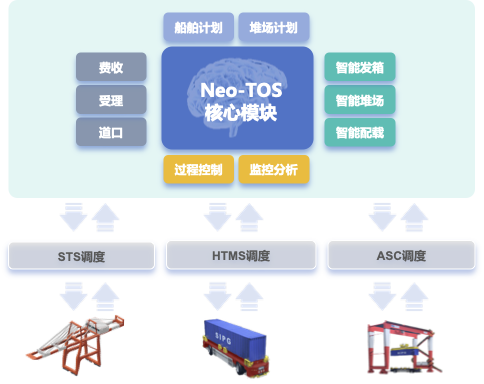 Neo-TOS的设计逻辑始终以全局资源动态调度为核心,构建起覆盖装卸、堆存和水平运输的全流程智能决策体系。系统能够实时融合多维度的信息,包括车流数据、设备状态和作业计划,从而实现多目标协同优化。